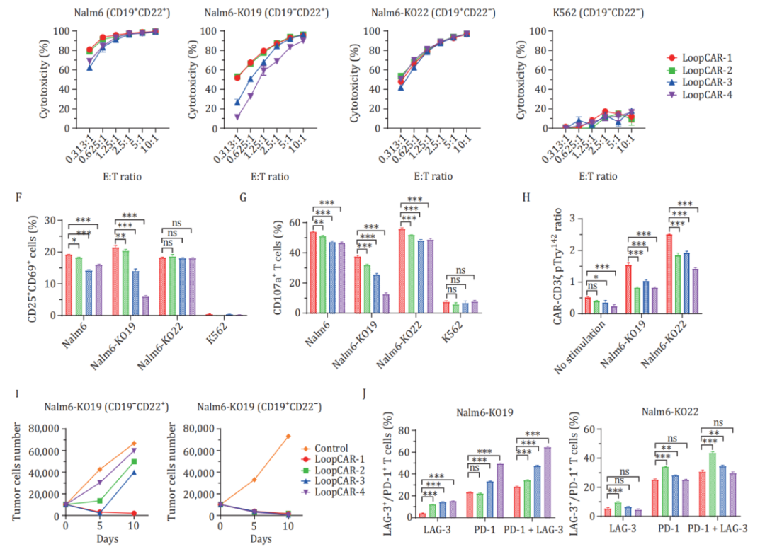 在四种结构中,LoopCAR-1和LoopCAR-2对Nalm6和Nalm6 KO19细胞的影响尤为显著。经过两轮靶细胞刺激后,所有结构的CAR-T都表现出相当的细胞毒性,而LoopCAR-1比其他双特异性CARs具有更持久的细胞杀伤活性。此外,我们观察到LoopCAR-1再刺激后效应T细胞群增加,但耗尽标志物的表达减少,这表明LoopCAR-1对CD19抗原丢失的靶细胞具有持续的抗肿瘤活性。以上结果显示了抗体和Linker的选择在CAR结构设计中的关键作用,LoopCAR-1是最佳的CD19/CD22双特异性CAR结构。