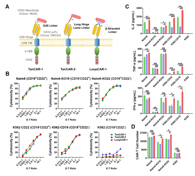 第一时间,研究人员分别采用了G4S Linker、Long Hinge Lama Linker和β-Stranded Loop Linker构建了三种不同形式的CD19/CD22 CAR,分别命名为TanCAR-1、TanCAR-2和LoopCAR-1。经验证,LoopCAR-1不仅显著增强CAR-T对B-ALL患者细胞的杀伤活性,也显著提高了细胞因子释放水平并促进细胞增殖。这些结果表明,环状结构可能是双特异性CD19/CD22 CAR的最佳设计。