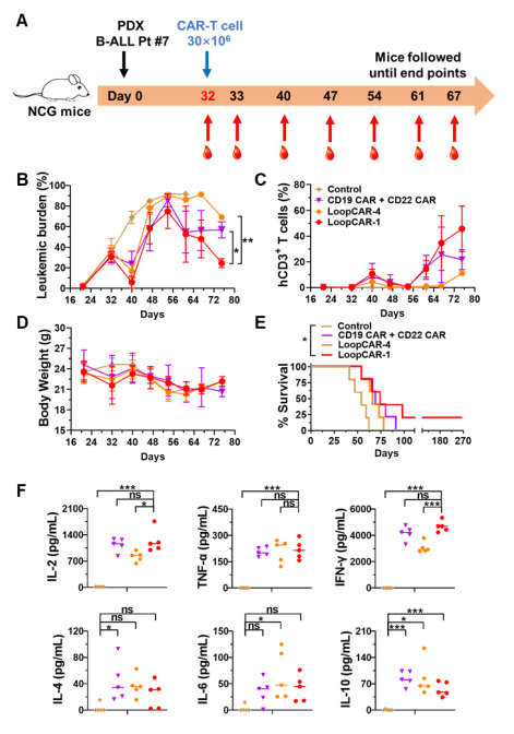 最后,研究人员评估了CAR-T细胞治疗对临床相关的B-ALL PDX模型的疗效。结果展示,尽管使用环状CAR或单靶点CAR联合治疗的小鼠均无法完全根除原代B-ALL细胞,但与其他CAR-T细胞疗法相比,LoopCAR-1治疗组在后期仍具有较强的抗白血病活性、更高的总存活率和更多的Th1细胞因子的产生。此外,复发后白血病细胞保持了CD19和CD22的表达,排除了CAR应激介导的抗原丢失。这些结果表明,LoopCAR-1对B-ALL PDX模型具有稳定的治疗效果,揭示其是一种很有前途的临床治疗候选药物。