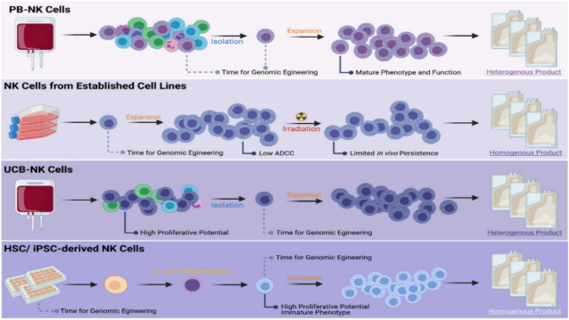 NK cells are usually induced from human embryonic stem cells (hESCs) or induced pluripotent stem cells (iPSCs), and the expansion cycle is 3-5 weeks, which can avoid the heterogeneity of NK cells between the recipient and the donor. | NK cells induced by iPSCs have the potential for malignant transformation and are at risk of tumorigenesis in the body; they are also potentially immunogenic and may trigger unexpected immune responses. |