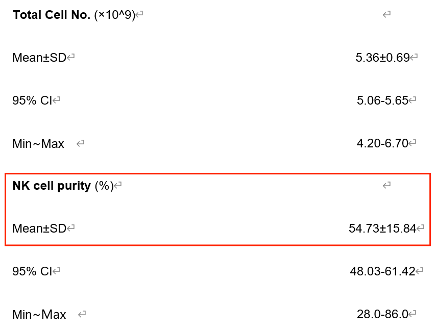 2022年上海长征医院输血科、上海交通大学免疫研究所等单位合作证实了回输NK细胞能显著缓解T细胞衰老、衰竭,抑制关键成分SASP(衰老相关分泌表型)[5]。该研究招募了37名中年健康参与者,其中32人静脉注射自体扩增NK细胞,5人静脉注射生理盐水。然后,顺利获得流式细胞术监测输注后4周内外周血衰老和耗竭T细胞的变化,以及血清中SASP相关因子的水平。NK纯度鉴定标准:CD56+/CD16+/CD3-,纯度大约在48-61%。