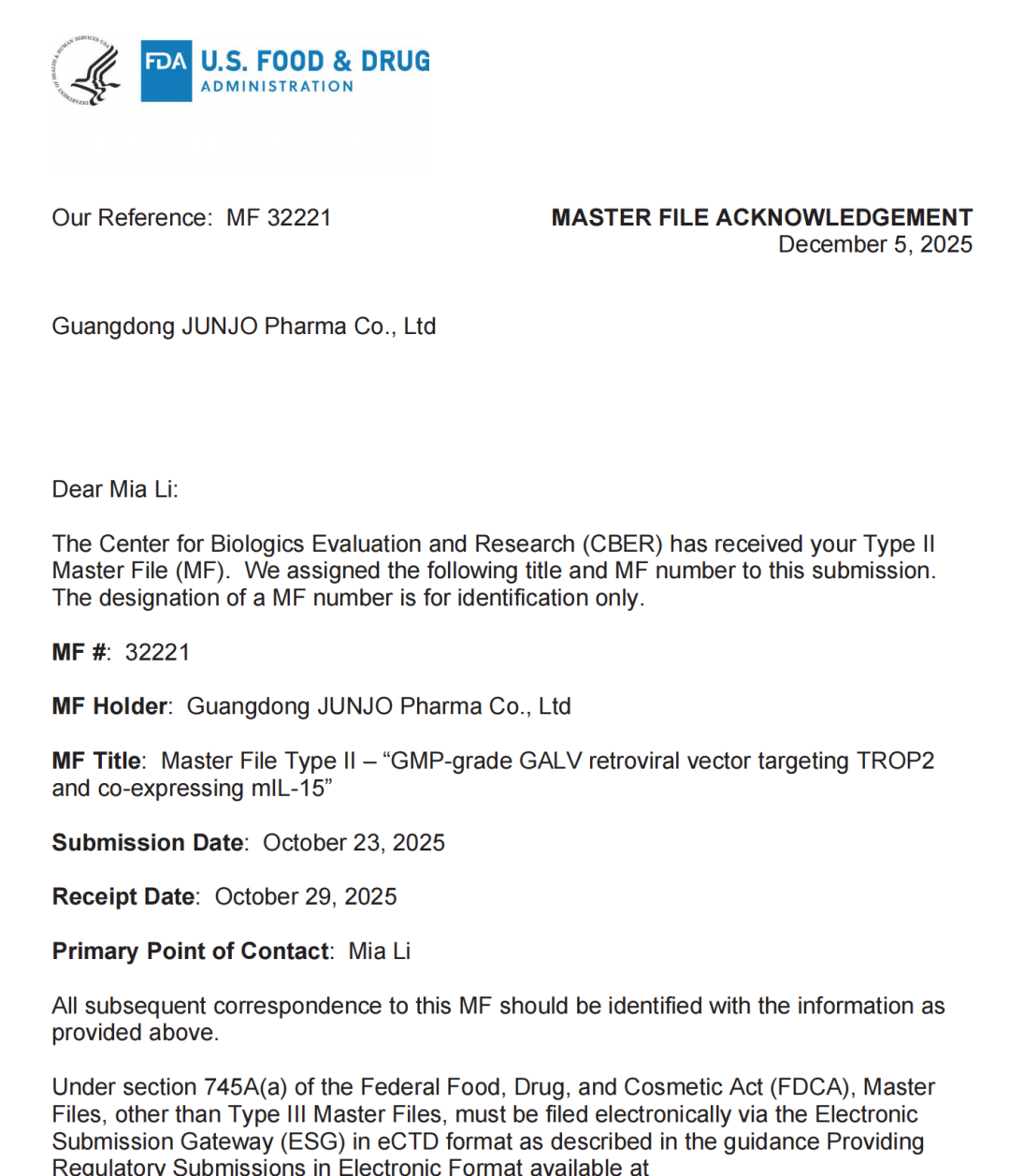 (中国·深圳,2025 年 12 月) ——凯发K8集团全资子公司广东君厚生物医药有限公司(Guangdong JUNJO Pharma Co., Ltd.)正式宣布,其提交至美国食品药品监督管理局(FDA)的GMP 级 GALV 逆转录病毒载体(GALV Retroviral Vector)已取得 FDA 生物制品评审中心(CBER)正式受理并完成备案登记,MF 编号为 MF 32221。该载体同时具备靶向 TROP2 并共表达 mIL-15(TROP2-IL15)的序列。FDA 回执已确认该 DMF 为 Type II Master File