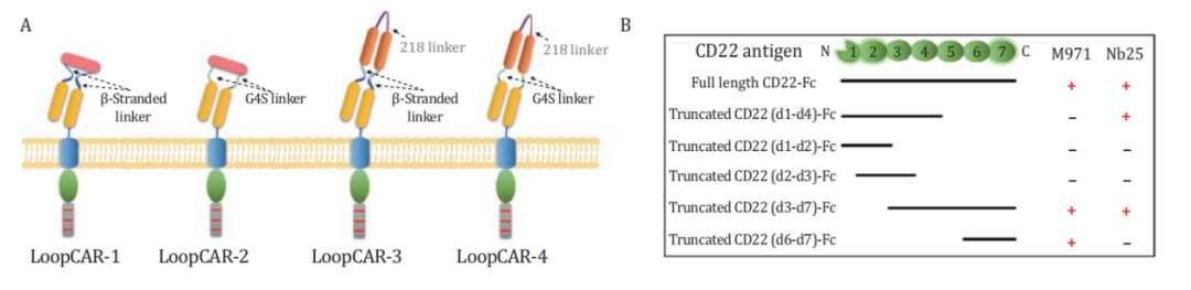 大多数报道的CD19/CD22 CAR-T细胞在CD19刺激下保持强烈的反应,但在CD22介导的活性下表现出较低的效力。考虑到scFv聚集引起的潜在tonic信号,我们提出了一种新的CD19/CD22双特异性结构(CD19/CD22 LoopCAR-1),用CD22纳米抗体取代CD22 scFv。与已经上临床的LoopCAR-4或其他环状结构CD19/CD22 CAR相比,CD19/CD22 LoopCAR-1表现出更好的CD22重定向活性,这表明LoopCAR-1可能给予了几何上最优的免疫突触(IS),并展现出有效的双重特异性和突出的抗白血病活性。这种新颖的结构设计为使用带有纳米抗体和scFv进行环状结构设计给予了独特的思路,并可能将CAR-T细胞治疗的范围扩展到实体肿瘤,以及癌症以外的适应症。