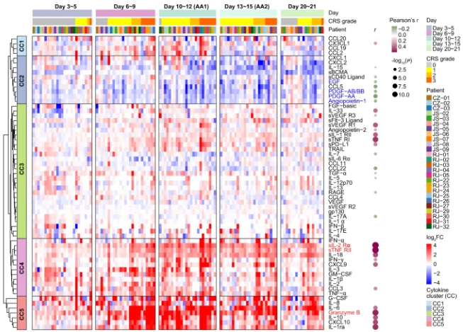 为了更深入地分析CRS的开展,研究人员将患者21天内的临床炎症反应分为5个时段,包括基线(输注前)、潜伏期(第3~5天)、发热期(第6~9天)、急性加重期(第10~15天,AA)和消退期(第20~21天)。评估以上时间段的血清数据,绘制细胞因子谱的整体图景。与基线相比,炎症分子在发热后期显著上调,在急性加重期达到较高水平,其中IL-6、颗粒酶B、IL-10、G-CSF和CXCL10在峰值时飙升了50~100倍,这表明在第6天到第15天的时期内有强烈的炎症反应。顺利获得无监督聚类,鉴定出5个细胞因子簇(CCs),其中CC3、CC4和CC5与平均CRS等级呈正相关,而CC2呈负相关。值得注意的是,在与CRS严重程度呈正相关的细胞因子中,sIL-2Rα、sTNF RII(均属于CC4)和颗粒酶B(属于CC5)表现出最强的相关性。