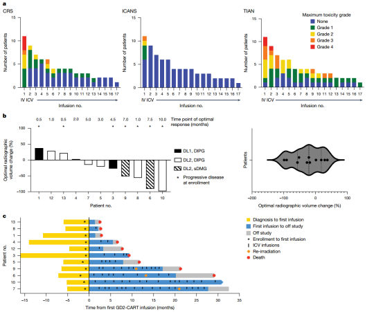 [1] Monje M, Mahdi J, Majzner R, et al. Intravenous and intracranial GD2-CAR T cells for H3K27M+ diffuse midline gliomas. Nature. 2025 Jan;637(8046):708-715. doi: 10.1038/s41586-024-08171-9. Epub 2024 Nov 13. Erratum in: Nature. 2024 Dec;636(8043):E6.